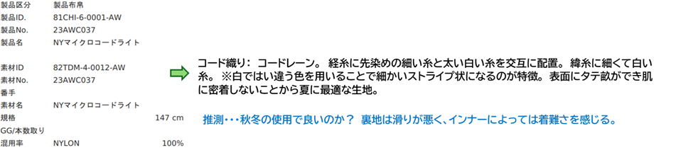 上表から生地の特徴や質感を読み取り(想像)してみましょう。サンプルをpickupする場合は展示会システムにアクセスしてください。↓↓↓