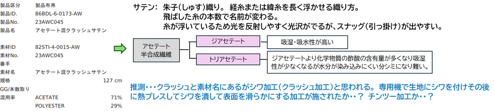 上表から生地の特徴や質感を読み取り(想像)してみましょう。サンプルをpickupする場合は展示会システムにアクセスしてください。↓↓↓