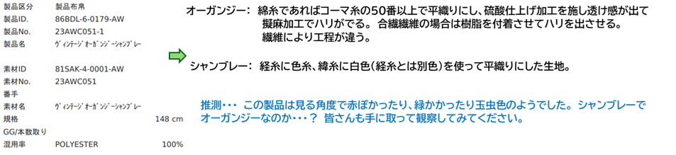上表から生地の特徴や質感を読み取り(想像)してみましょう。サンプルをpickupする場合は展示会システムにアクセスしてください。↓↓↓