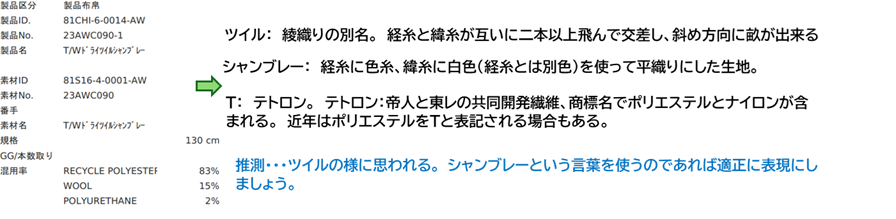 上表から生地の特徴や質感を読み取り(想像)してみましょう。サンプルをpickupする場合は展示会システムにアクセスしてください。↓↓↓