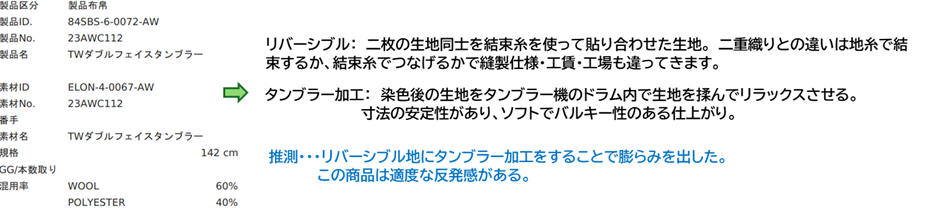 上表から生地の特徴や質感を読み取り(想像)してみましょう。サンプルをpickupする場合は展示会システムにアクセスしてください。↓↓↓