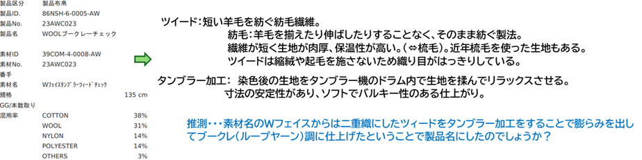 上表から生地の特徴や質感を読み取り(想像)してみましょう。サンプルをpickupする場合は展示会システムにアクセスしてください。↓↓↓