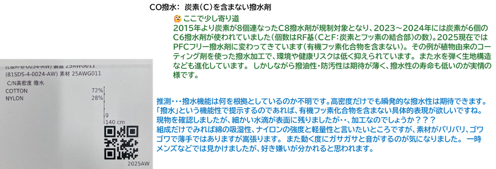2015年より炭素が8個連なったC8撥水剤が規制対象となり、2023~2024年には炭素が6個のC6撥水剤が使われていました(個数はRF基(CとF:炭素とフッ素の結合部)の数)。2025現在ではPFCフリー撥水剤に変わってきています(有機フッ素化合物を含まない)。 その例が植物由来のコーティング剤を使った撥水加工で、環境や健康リスクは低く抑えられています。 また水を弾く生地構造なども進化しています。 しかしながら撥油性・防汚性は期待が薄く、撥水性の寿命も低いのが実情の様です。