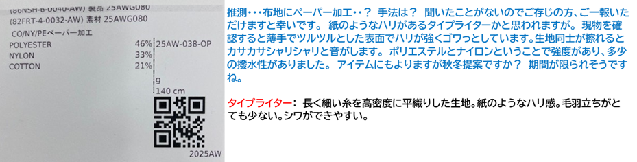 上表から生地の特徴や質感を読み取り(想像)してみましょう。サンプルをpickupする場合は展示会システムにアクセスしてください。↓↓↓
