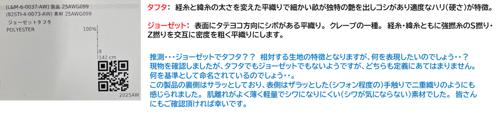 ジョーゼット: 表面にタテヨコ方向にシボがある平織り。 クレープの一種。 経糸・緯糸ともに強撚糸のS撚り・Z撚りを交互に密度を粗く平織りにします。