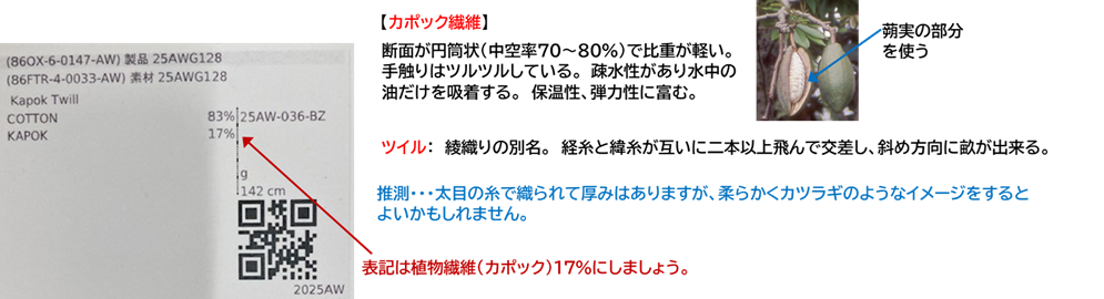 カポック: 断面が円筒状(中空率70~80%)で比重が軽い。手触りはツルツルしている。 疎水性があり水中の油だけを吸着する。 保温性、弾力性に富む。