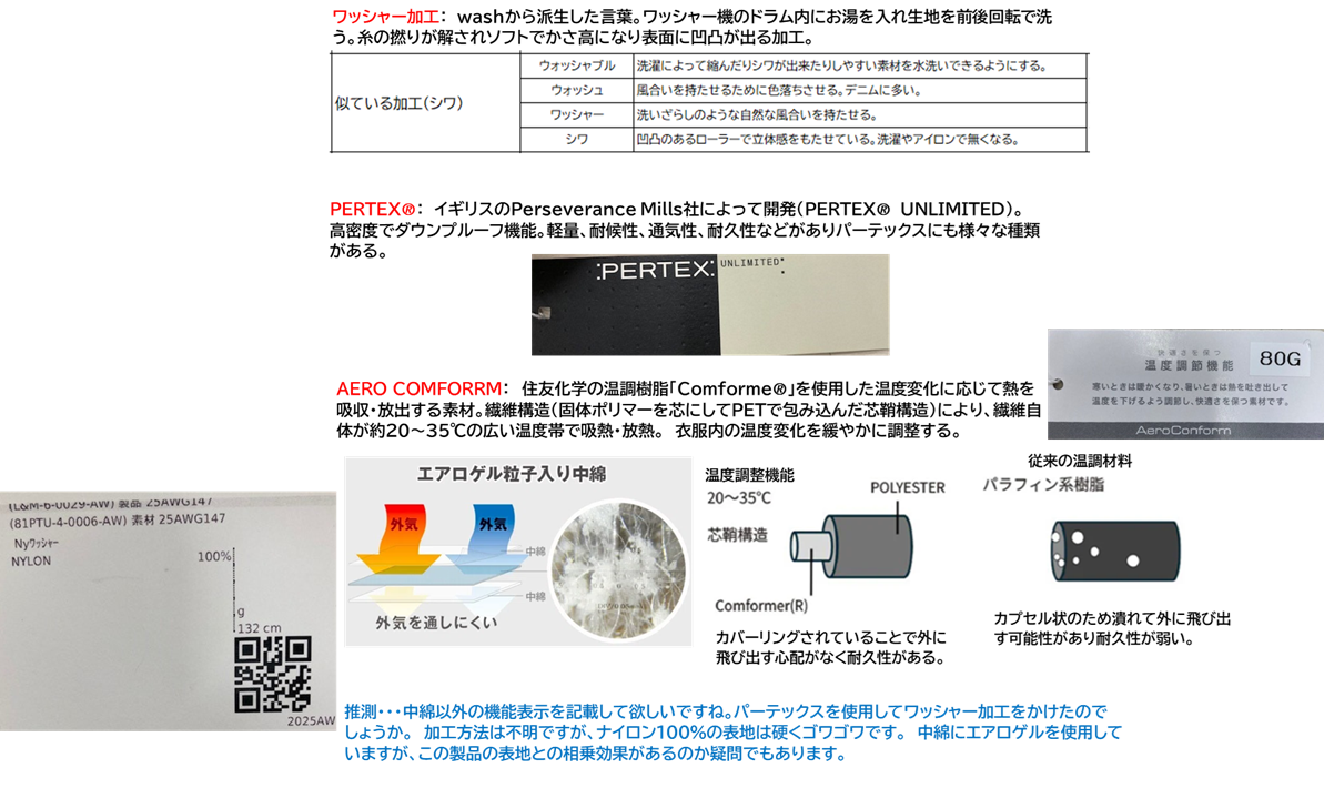 ワッシャー加工: washから派生した言葉。ワッシャー機のドラム内にお湯を入れ生地を前後回転で洗う。糸の撚りが解されソフトでかさ高になり表面に凹凸が出る加工。