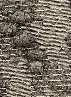 ジャカード: ジャカード織機(又は電子ジャカード)で織られる立体的な柄が出来る。使用する糸は先染めとなる。 様々な素材や柄が表現できる。